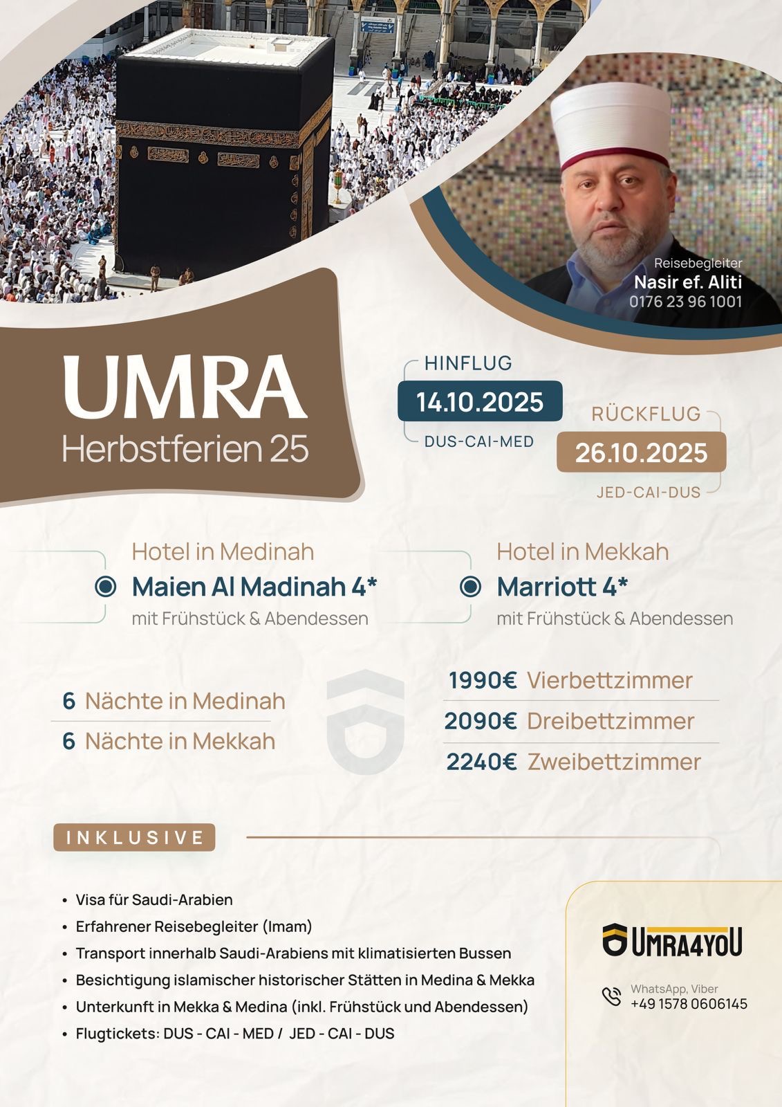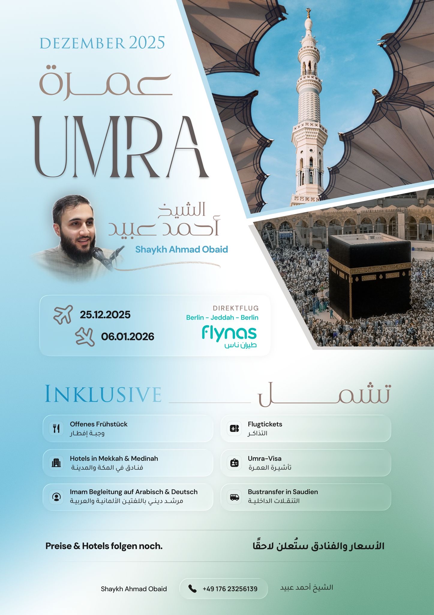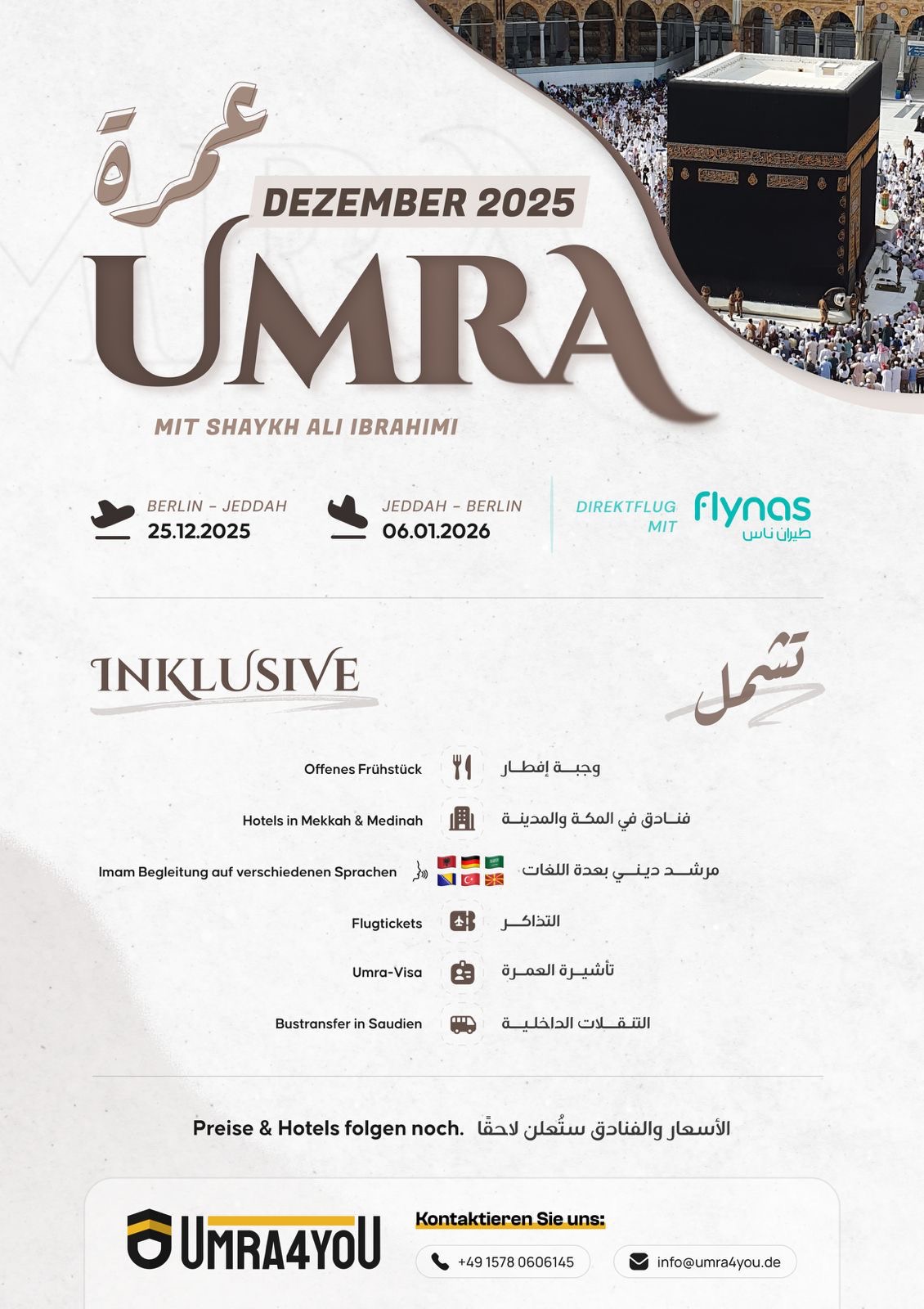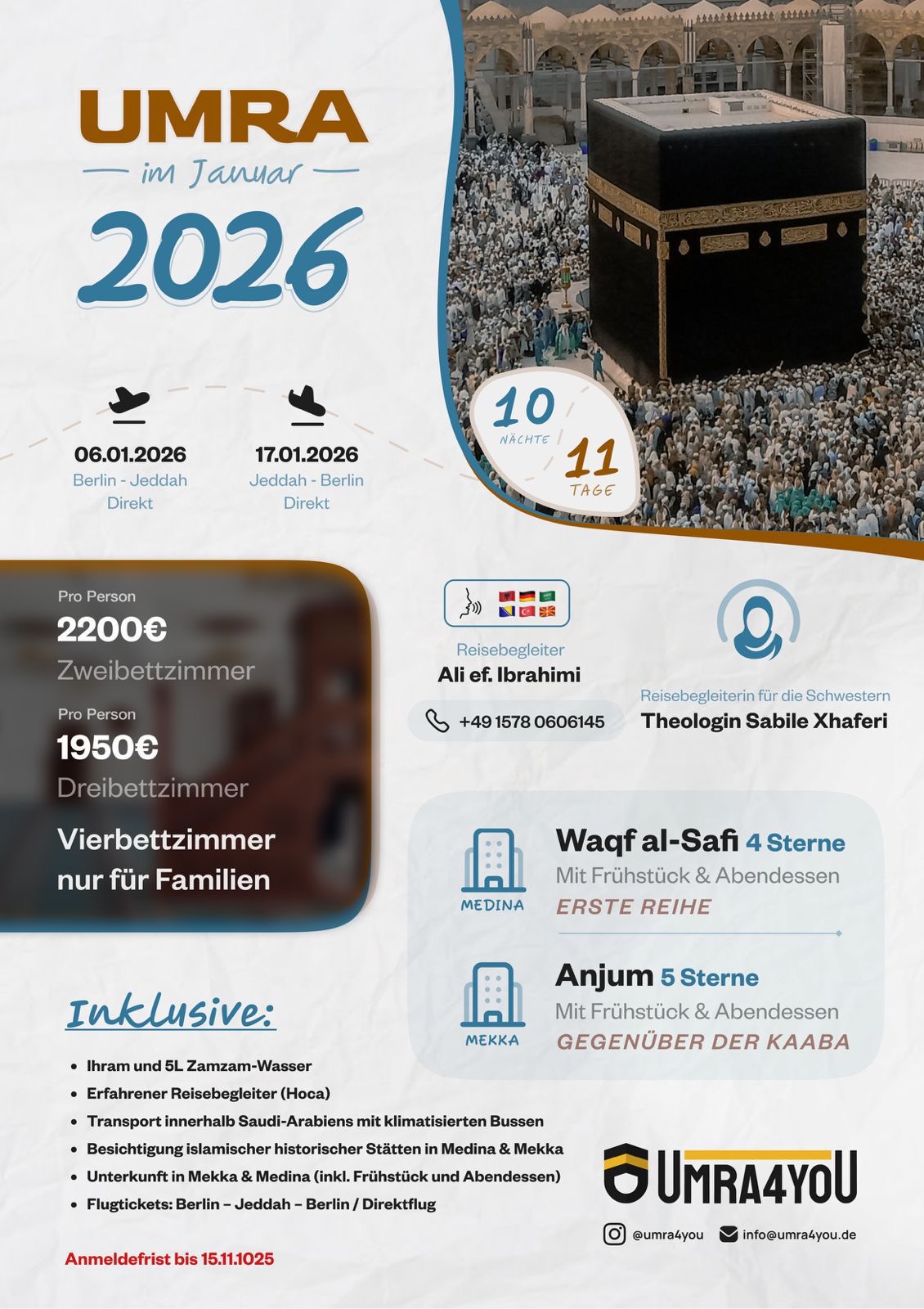 Unsere Mission ist es, Ihnen eine reibungslose und unvergessliche Reise zu ermöglichen. Mit jahrelanger Erfahrung bieten wir maßgeschneiderte Umrah-Arrangements und umfassende Dienstleistungen, um Ihre Pilgerreise angenehm und sorgenfrei zu gestalten.